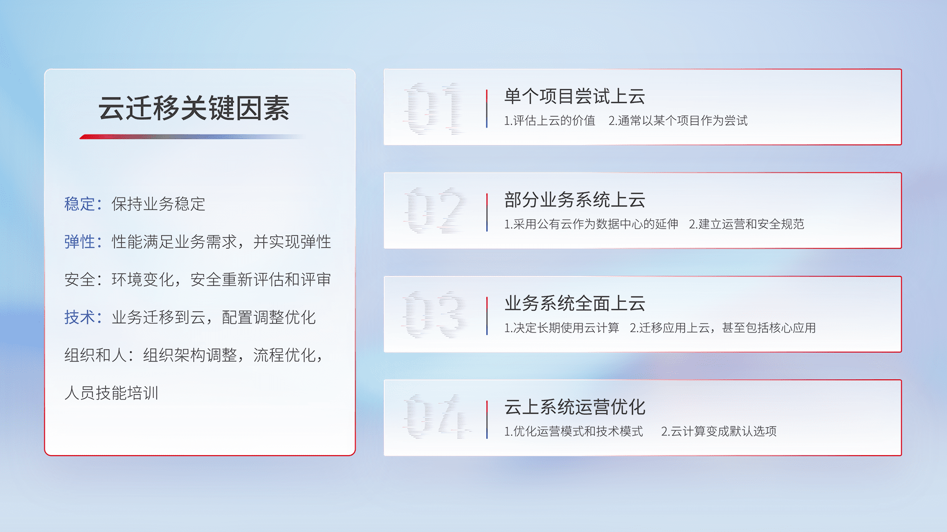结合实际业务,,,,从规划设计、、、云平台选型、、、、云原生改造、、、数据迁移、、、集成交付,,,,迁移全过程为客户识别最佳上云路径,,,,做好风险识别管理,,设计网络架构、、、、身份权限、、、、安全审计合规、、操作审计、、、日志审计、、、监控告警策略、、、多站点容灾设计等,,对云上基础设施进行整体规划,,,提升IT治理水平,,以满足弹性、、、高可用、、、高性能的需求。。。。