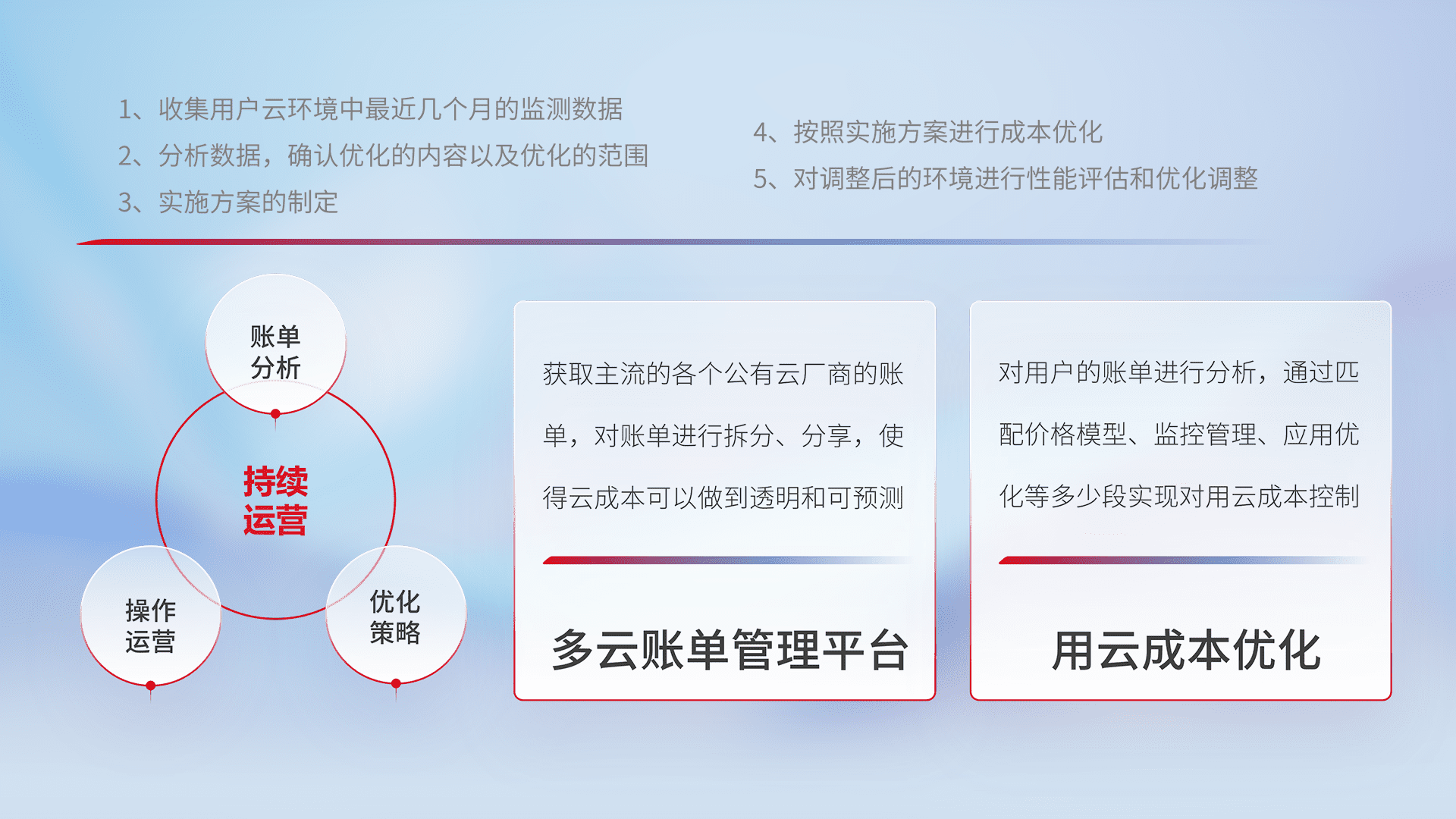 通过多云纳管,,,,以统一的资源数据模型把客户的云资源进行抽象和封装,,进而实现对多云资源的统一操作,,保障云资源管理的可靠性、、、、稳定性与可用性。。量身定制化运维内容,,,,配置、、、、开发运维、、、补丁管理、、备份、、监控、、、、认证和访问管理、、、审计和日常巡检等,,保障在用云过程中的可靠度,,稳定度以及高可用率。。